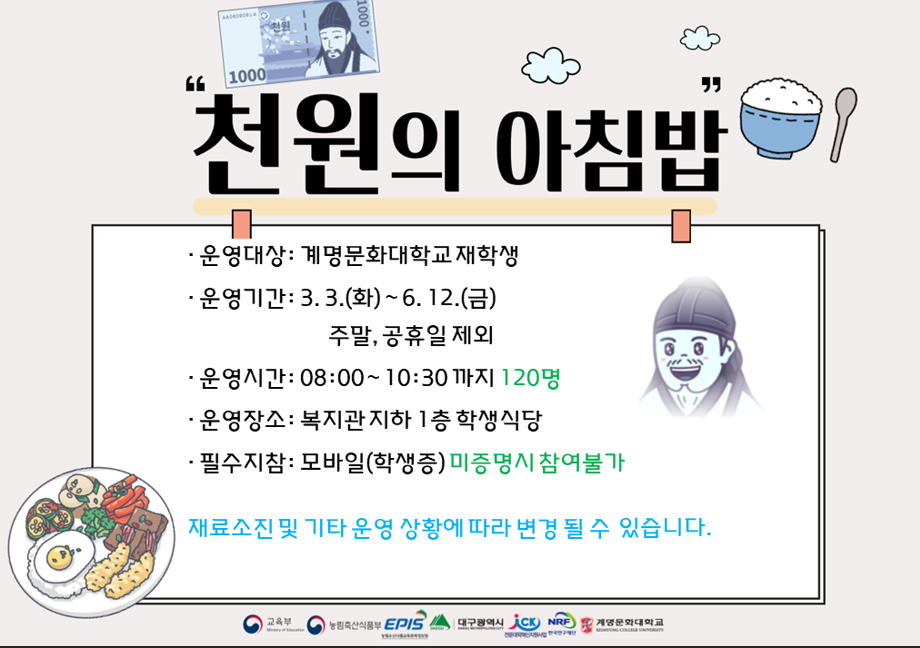농림축산식품부와 농림수산식품교육문화정보원에서 쌀 소비 활성화와 관련하여 아침식사 결식률이 높은 학생들에게 저렴한 비용부담으로 아침밥을 제공하여 건강과 복지증진에 기여하고자 천원의 아침밥 사업을 추진하고 있습니다.